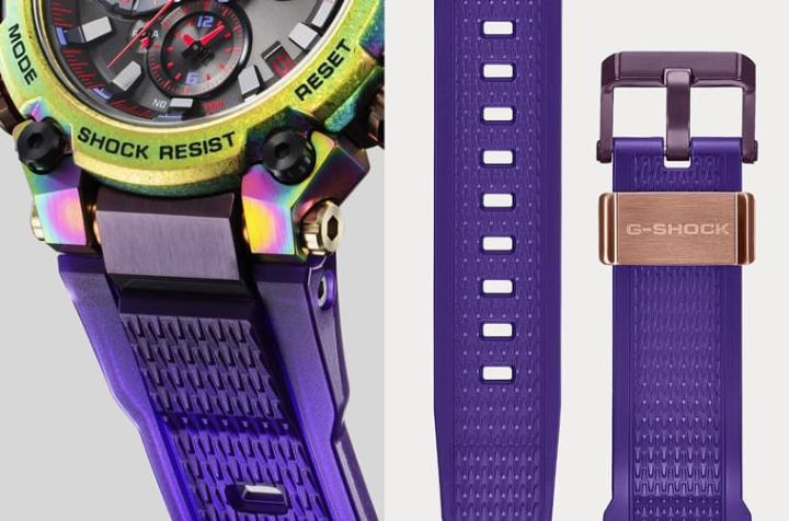除了表壳与表带的明艳颜色,MTG-B3000PRB的表扣与表带扣环也分别经过棕色与紫色离子IP镀膜点缀,使得手表的色彩美学可以贯穿整体,就算是表面无法第一眼就看到的部分,还是一丝不苟地呼应着“极光”主题,让人在把玩手表的过程中倍感享受。