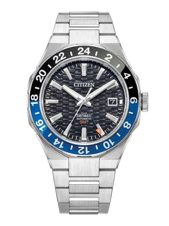 不过相较于CITIZEN是否展现更有高级制表氛围的工艺,我们其实是先被这些Series 8 GMT手表的外型所吸引。这款新作的表壳以不锈钢制成,表径为41mm,品牌首先推出的作品有三款,分别是蓝红双色表圈配蓝色面盘、蓝黑双色表圈配黑色面盘,以及表壳和炼带镀成金色、采用棕色与米色双色表圈、搭配不规则雕琢纹路的黄金面盘,是不是觉得有点熟悉?光看表圈的配色就会让人想起某知名”R”牌的百事圈、蓝黑圈与沙士圈两地时间手表。