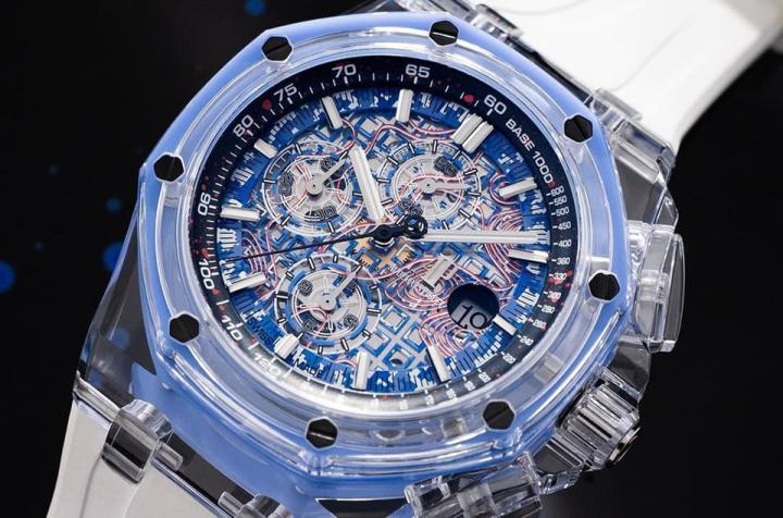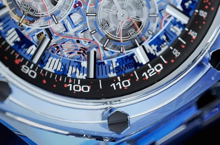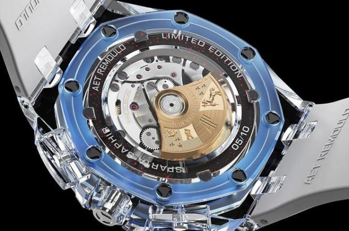 Azure Blue的表背透明底盖边缘一样呈现淡淡的蓝色,并用黑色螺丝牢牢固定,透明底盖边缘拥有和测速计刻度一致的黑底红点设计,至于底盖上这回并没有多加其他图案或色彩,让佩戴者可以好好欣赏手表搭载的3126/3840自动机芯,改装表品牌并未特别修改机芯零件,所以这部分能够体现AP原厂的制表工艺本色。Azure Blue仅限量推出10只。
