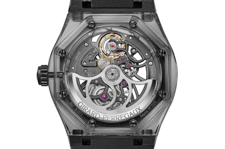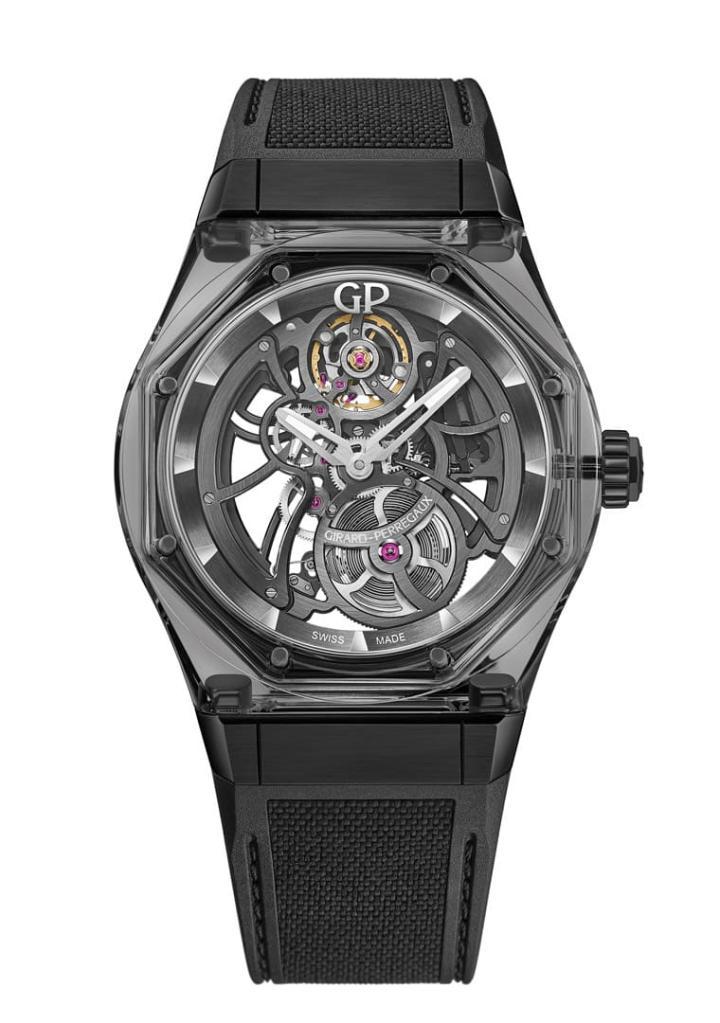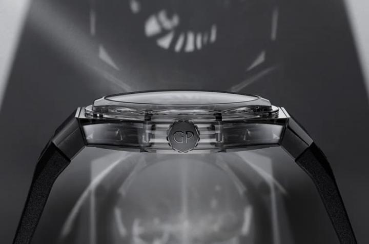 金属化蓝宝石水晶、黑色镀层钛金属材质/GP01800-1143自动上炼机芯/时、分显示/蓝宝石水晶镜面、透明底盖/防水30米/表径44mm/参考价:¥ 743,900