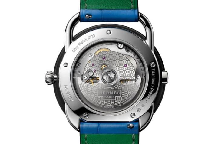 Arceau Le temps voyageur Only Watch的表壳以高贵的铂金材质制成,搭配黑色DLC钛金属表圈,突显出Arceau系列不对称表耳造型的招牌美学,另外爱马仕也替手表配置雾面米克诺斯蓝色鳄鱼皮表带,衬里则搭配仙人掌绿色皮革,先一步替手表塑造出活泼大胆的个性。