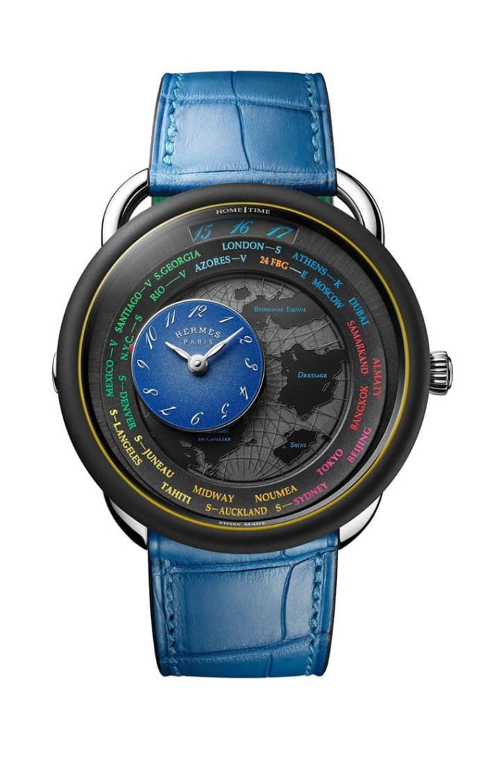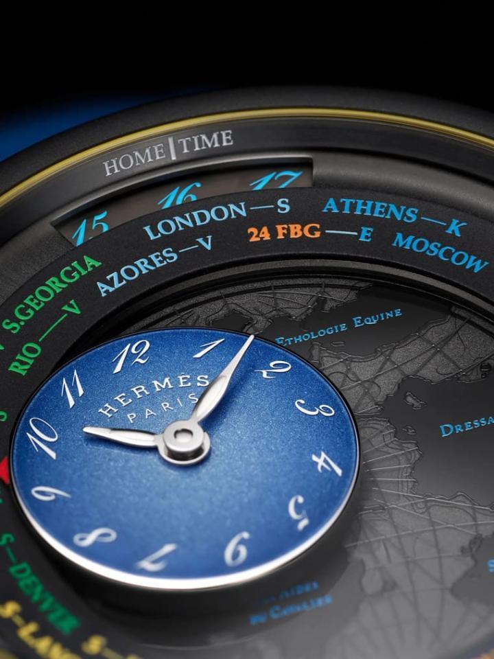 手表的世界时间显示由爱马仕与合作多时的独立制表师Jean-François Mojon共同开发出全新世界时间模组,佩戴者需按下9点方向的按把设置两地时间,一旦按下按把,紧邻小表盘的一枚红色三角形箭头就会以一个城市为单位跳动并带动表盘移位,放开按把则设定完成,此时12点视窗显示的是原居地时间,而小表盘便是展示所在地时间,使用与阅读都很简易。