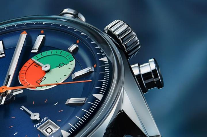 表款已不锈钢材质制作39mm表壳,蓝色面盘搭配湖水绿色以及湖水绿、深绿与红橘色小表盘的组合则是从第一代Skipper计时码表获得的灵感。新款由于内部机芯已然不同,因此3点方向变为分钟计时盘、9点方向则是小时计时盘,6点方向其实还有小秒显示,不过品牌并未特别做出与前述两枚小表盘一致的凹陷层次,而直接在面盘上加上简略的秒数刻度,与同方位的日期显示提供佩戴者完整的时间资讯。