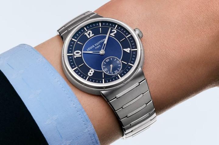 融合巴黎时代风尚与瑞士制表技术的Tambour不锈钢自动小三针腕表,直径40mm、厚度8.3 mm,整体以拉丝饰面装饰圆形表壳,喷砂表圈加上抛光边缘增加层次。表壳侧面也就是最重要的弧形侧面,在与小时标记对齐处,刻上LOUIS VUITTON品牌12个字母,在清晰精准之余,表现了Tambour腕表系列不败的中性设计。不仅如此,此表还有另一个首创,是路易威登第一款采用整合式表带的腕表,与整体采用拉丝饰面的表壳相同,也使用拉丝不锈钢表炼,事实上是以多个拉丝炼节组成,仿佛一体成型,而且炼带炼节的上下表面均为凸面,形成连贯的圆形线条更能紧密舒适地贴合整个手腕。炼节末端刻有 LOUIS VUITTON 字样,并搭配三片式折叠扣的隐藏式开口,极其简约。加上无表带头的结构,表炼与表壳更是无缝融合,加强坚固性和灵活性的佩戴感受。
