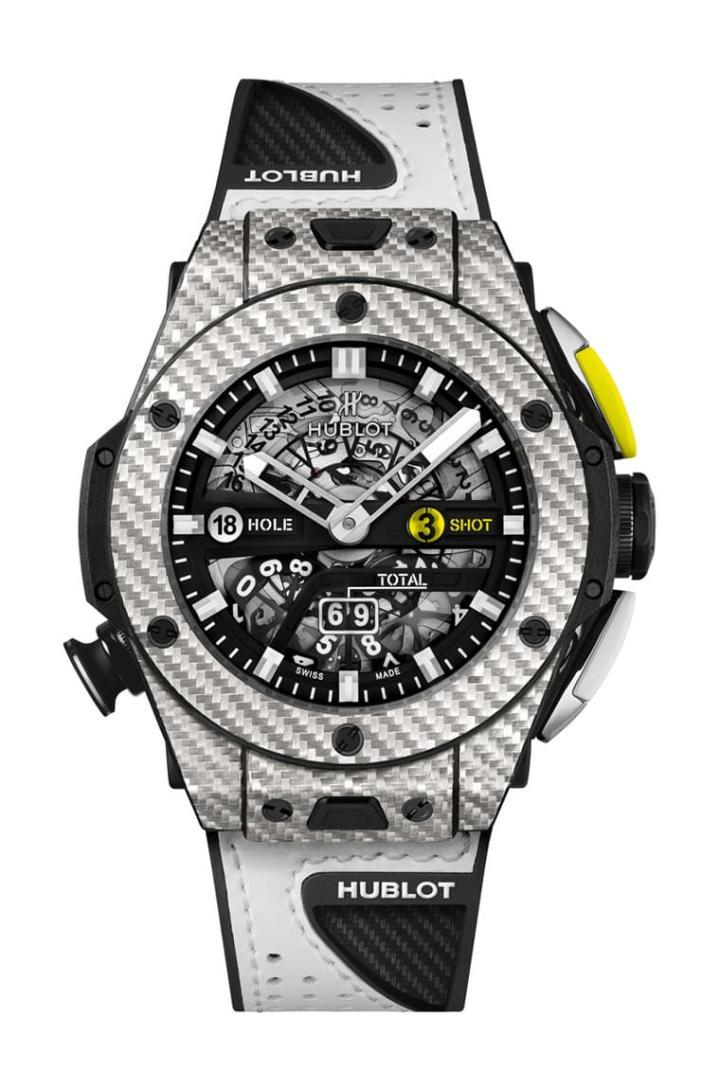 镀铝碳纤维材质/HUB1580自动上炼机芯/时、分显示/挥杆数显示机制/总杆数显示/蓝宝石水晶镜面、透明底盖/防水100米/表径45mm/限量100只
