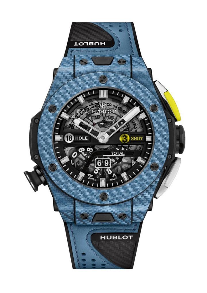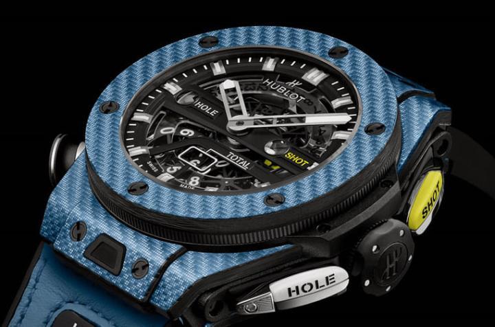 表款使用开面设计露出密致的机械结构,然而除了时、分显示外,面盘还有一些从事高尔夫球时能够用上的“特殊功能”,这一切仰赖Big Bang Golf晴空蓝高尔夫手表搭载的HUB1580自动上炼机芯,这枚机芯别出心裁地融入与高尔夫运动相关的统计功能。操作方式概要说明如下:启动2点方向的按把时,可启动“挥杆数显示机制”,从3点和9点的显示窗中可窥见挥杆次数并计算每一洞的杆数。按下4点方向的按把可以将挥杆数显示机制归零,至于6点方向的总杆数显示会持续计算杆数,随着比赛不断更新,直到佩戴者按下位于8点钟方向、长得有点像发球座的按把时,这时候所有的高尔夫球显示功能才会完全归零。你可能会担心在比赛中如果不小心按压到8点钟的按把,那么之前所记录的成绩不就会化为乌有,针对这点宇舶贴心地设计了防误触装置,至需要旋转8点钟的按把45度就可加以锁定,防止过程中的意外导致成绩计算出现人为疏失。
