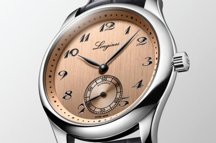 首先看的是Flagship Heritage,Flagship是1950年代末期就一路窜红成品牌的代表性产品,2023年品牌将月相功能融入这款系列中,表款延续1957年原版作品的独特弧形面盘,品牌再从中延伸出银色蛋白石、银色或蓝色阳光放射纹三种配色版本。面盘镶有镀金或银色时标,其中3、9与12点钟方位的时标采用加长设计衬托出面盘的复古情怀,而浪琴表也会视面盘颜色替手表搭配棕色、灰色或蓝色皮革表带。