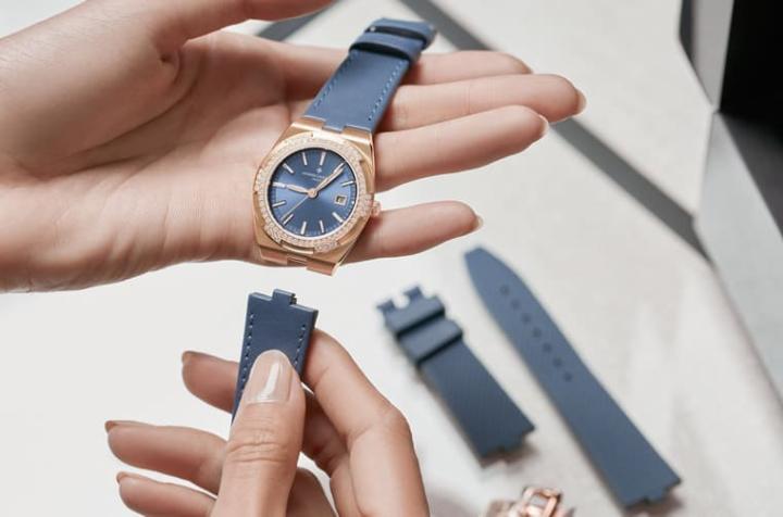 表款的防水性能为基本的50米,与大三针加日期功能都是生活中便利实用的规格,而前述手表具备的两种表带不论材质皆同样是晴山蓝色,使得手表整体配色和谐悦目,与系列本有的不锈钢丹宁蓝色面盘Overseas石英女表散发出各有千秋的吸引力。