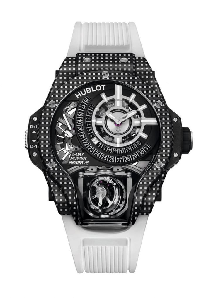 白色3D碳纤维材质/HUB9009.H1.RA.B手动上炼机芯/时、分、小秒、日期显示/陀飞轮装置/动力储存显示/蓝宝石水晶镜面/防水30米/表径49mm/限量8只/参考价:¥ 1,409,750