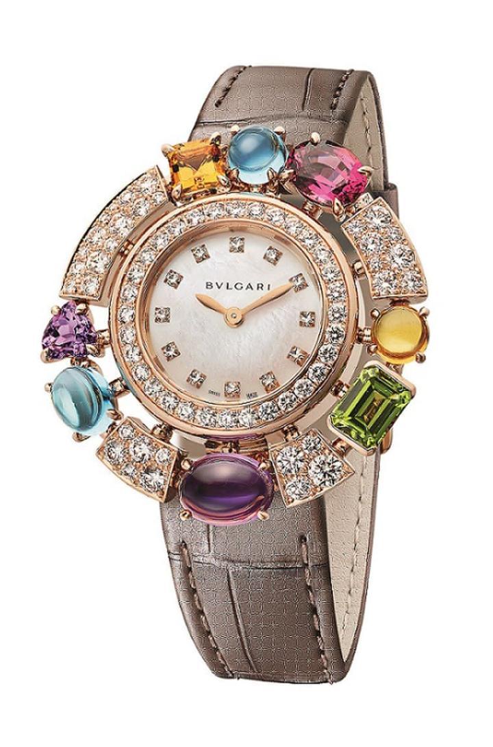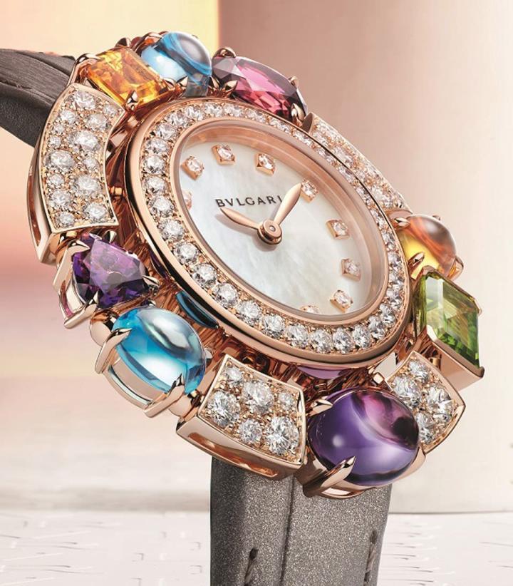 Allegra系列不只有珠宝作品,宝格丽亦将“时间即珠宝”的理念带入生活,打造最新的鸡尾酒珠宝腕表。腕表将碧玺、黄水晶、玫瑰榴石和橄榄石,以各种充满欢乐的造型呈现,并搭配粉色或黄色刚玉点缀,持续以率性欢快的质感吸引女性目光,宛如手腕上绽放的娇艳花朵垂涎欲滴,让人一见倾心。