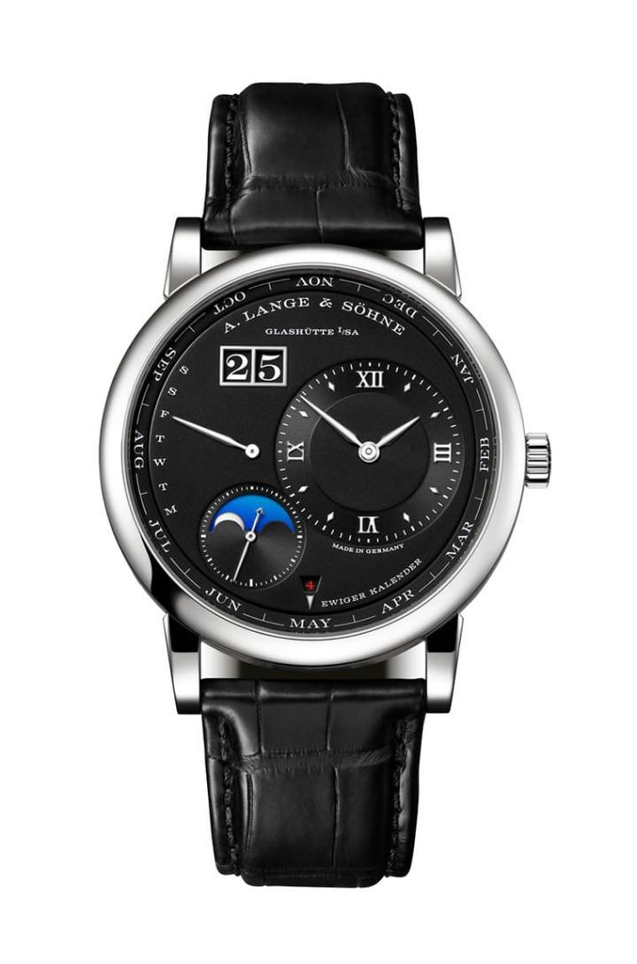 全新Lange 1 Perpetual Calendar的表径依旧为41.9mm,不过朗格改以铂金制作表壳,搭配黑色鳄鱼皮表带和黑色面盘,隽永熟悉的样貌与Lange 1系列其他款式有高度既视感。手表面盘外围是月份环刻度,透过6点方向的倒三角形指标让人明白当前的月份,至于星期显示和大日期显示分别位于9点与11点方向,加上月份环指标上方小视窗的闰年显示,当然还有面盘右侧的偏心时、分小表盘,完整呈现手表所有的时间资讯。
