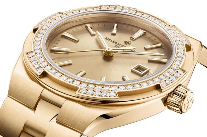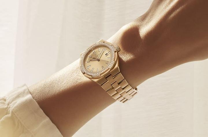 新款35mm Overseas自动表从表壳、炼带到面盘都是清一色粉红金色系,单色格调风格鲜明,品牌精心在马耳他十字造型六边型表圈精心镶嵌90颗璀璨美钻,辉映出整体的单色调美感。腕表设计宛若一件纤巧精致的珠宝作品,女性佩戴在手上倍感优雅迷人。