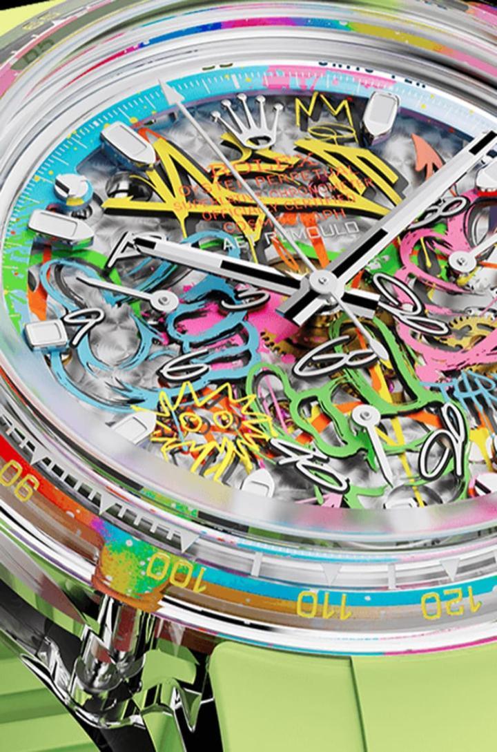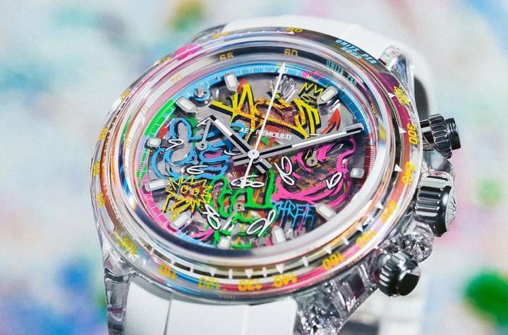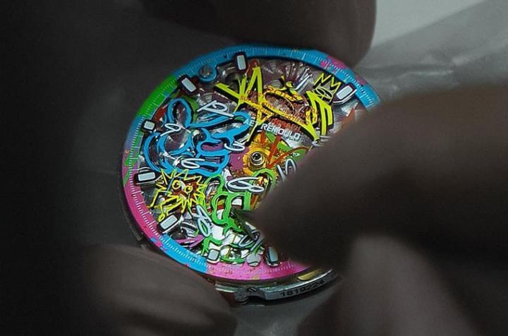 AET REMOULD相当欣赏涂鸦艺术的自由精神,所以积极把它们引入手表创作中,让表壳与面盘化身墙面,缤纷色彩可以在上头尽情飞舞。改装表品牌之所以选择用蓝宝石水晶制作表壳,除了其硬度高、耐用之外,也还有视觉穿透效果和闪亮光泽的特点,为了突显表圈与面盘上的彩色线条,因此选择不太会抢走彩色焦点的透明表壳,让人可以一次看到涂鸦画作与手表内部的机芯。