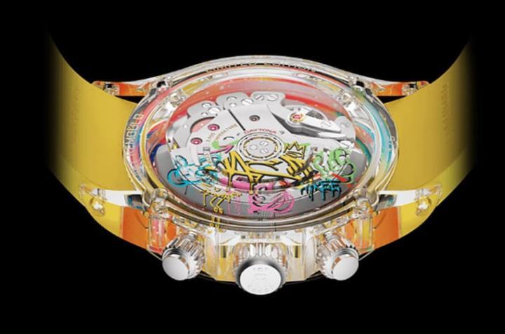 Daytona “Three”的蓝宝石表圈上的测速计刻度填入白色、阿拉伯数字则是黄色,表圈底下夹了一个五颜六色的环状装饰,让表圈呈现迷人的彩色效果。同样的混合色彩概念也延续到面盘外缘的刻度环上,不规则分布的色块仿佛预告著面盘上涂鸦画作的精彩。