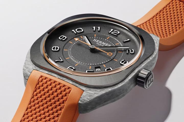 四款H08运动表分别搭配蓝色、绿色、黄色与爱马仕招牌的橘色立体编织纹路橡胶表带,此举不只是营造抢眼印象,也和手表面盘的细节颜色有里应外合的别致设计用心。圆形面盘色调令人想起混凝土的颜色,而且爱马仕还以粒纹修饰搭配面盘的高低差设计强化层次美感,包括字体自成一格的阿拉伯数字时标也是立体镶嵌设计,并与灰色时、分指针同步涂上白色夜光物料。