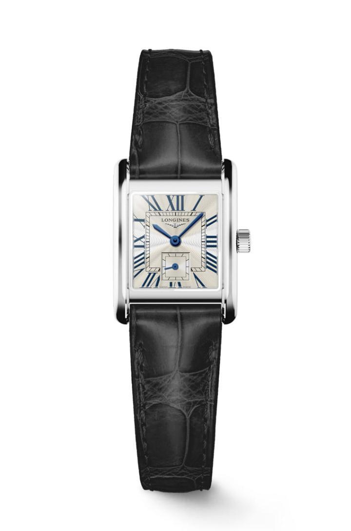 在钻表的款式中,除了Cosmo面盘和罗马”Flinqué”饰纹面盘各一之外,另有四款令人惊艳的优雅色彩,分别是象牙白、薄荷绿、淡雅粉与宁静蓝的面盘采用罗马镀金镂雕设计,这种设计以镂空的罗马数字时标覆蓋面盘外侧并搭配搭配棒状时标,与镀金指针形成暧暧内含光的气质,内侧的矩形框框中则有放射状机刻雕花装饰点缀,连同6点方向的方形小秒盘也有金色边框,立体感强烈又赏心悦目,而且浪琴表还替手表配置和面盘颜色呼应的渲染皮革表带,整体视觉效果相当强烈。