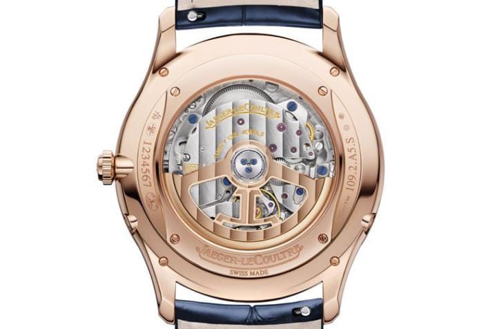 表背的透明底盖露出积家打造的925自动机芯,佩戴者可以一窥18K玫瑰金镂空自动盘,包括自动盘与其他机芯零件都经过品牌进一步修饰,如日内瓦波纹、鱼鳞纹以及倒角抛光等等,机芯能累积输出70小时动能,以其具备的进阶功能而言属于较长效型的手表,雅致风格中也顾及了日常佩戴的便利性。