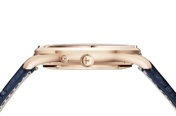 表款采用渐变蓝色太阳放射状饰纹面盘,深蓝色调由面盘中央往边缘愈变愈深,引人视线自然聚焦在面盘是的显时资讯,积家在面盘安排了三角锥形时标与”JL”标志,并由太子妃式指针搭配时标与刻度指示时间足迹,这些细节由于也都是和表壳相同的玫瑰金色,因此在渐变蓝色太阳放射状饰纹面盘显得对比强烈、读时清晰。