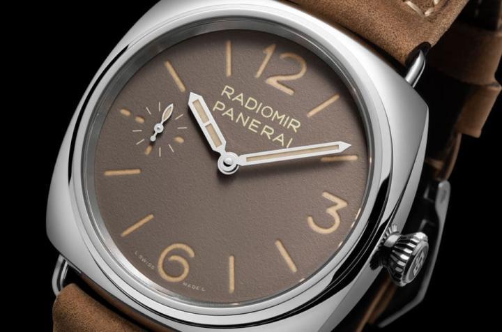 PAM01385招牌的枕型表壳以不锈钢材质制作,表径45mm算是品牌考量到现今市场的接受度所作出的调整,手表拥有圆锥形表冠、深棕色皮革表带,这些细节建构出手表的复古基调。而面盘采用的雾面灰褐色在目前的Radiomir系列中显得独树一帜,另外品牌只在3点、6点和12点方向设置阿拉伯数字时标(其他方位为棒状时标)这点明显就是传承自首款Radiomir手表而来。