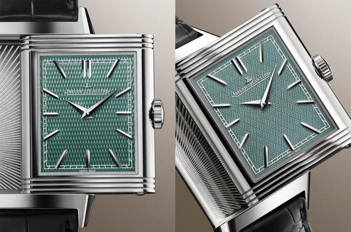 积家采用白金材质制作两款Reverso Tribute Enamel的表壳,它们都搭配黑色鳄鱼皮表带,正面的二针面盘最先映入眼帘的是先以手工机刻形成麦粒扭索饰纹,再以四至五层半透明的绿色珐瑯覆于表面的造型(《木曾海道小野瀑布》款),制作过程约3~4小时;至于《和州吉野义经马洗瀑布》的面盘机刻纹路共由800道以上线条构成,且每道线条需要在车床上刻画5次(总计4,000次),光是这部分的工时就要8小时左右,后续也同样要涂覆半透明绿色珐瑯至少四层,反复上釉、烧制,积家会再花额外的8小时才能制作完成,因此《和州吉野义经马洗瀑布》款式的正面面盘制作难度相对更高。两款表的面盘都有轨道式刻度、刻面镶贴时标与太子妃式指针等元素,搭配面盘装饰工艺简洁俐落却又别具特色的展示时间推移的轨迹。