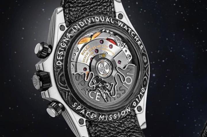 惊喜还没完,表背透明底盖边缘与表圈一样是碳纤维材质,所以我们可以清楚看见手表里面4130机芯的样貌,DiW这次还重新制作了机芯自动盘,以阳刻形式在自动盘刻出”SPACE MISSION”字样、太空人与安全绳图案,将面盘上的太空冒险延续到表背,而且从表圈边缘的碳纤维材质中也透露出Daytona Space Mission的发行数量仅10只的稀有性。