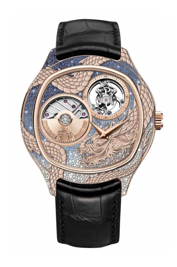 最后还有两款可供客户订制的高级珠宝袖口手表,一款为镶嵌缟玛瑙的龙主题造型,一款则是镶嵌粉红红宝石、蓝宝石与尖晶石等宝石的凤凰主题造型,这两款作品都是独一无二款式,因此客户还可以进一步指定装饰工艺以及宝石种类。