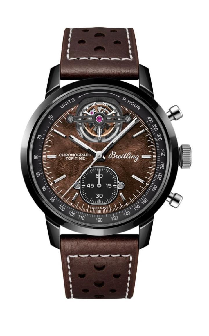 Top Time系列2023年首度进阶至陀飞轮等级,为此百年灵分别采用青铜、陶瓷和钛金属组合制作三款表,并搭配棕色或深蓝色穿孔小牛皮表带,串联手表与赛车的渊源。Top Time经典汽车系列最新作品的设计既现代又复古,特征如搭配蘑菇造型计时按把和上/下面盘设计,陀飞轮位于12点钟位置。6点钟位置的分钟计时器设有一个“方圆形”(部分圆形,部分方形)小表盘显示秒数,此外面盘外缘则有测速计刻度。