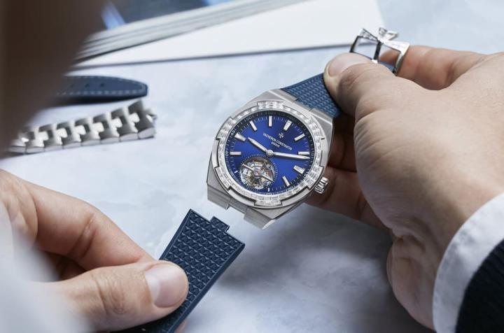 身为Overseas系列中功能与材质都更为讲究的高端款式,Overseas高级珠宝陀飞轮除了配备白金链带之外,江诗丹顿也会同步提供蓝色橡胶表带以及蓝色小牛皮表带,由于此系列都具备表带快拆系统,因此随附的表带不会让人感到困扰,反而可以随时随地轻松更换表带,营造出不一样的视觉与穿搭感受;附带一提,包括表带的白金针扣也会镶上16颗长阶梯形切割钻石,呼应手表正面的高贵气韵。