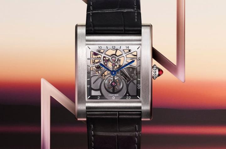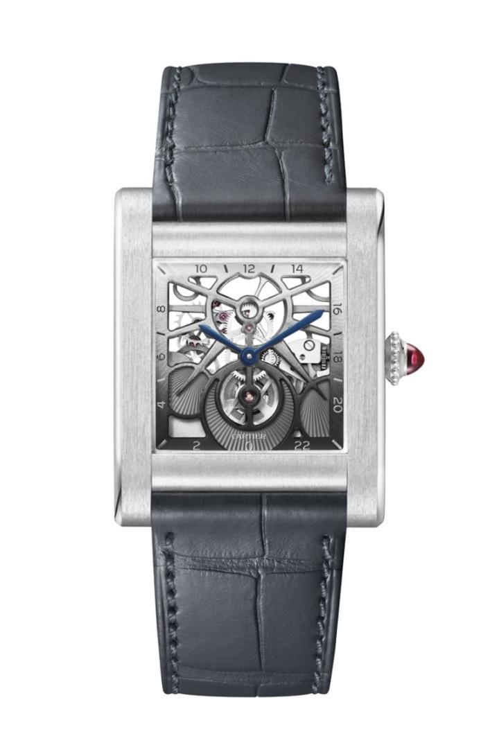 系列中还有一款作品为卡地亚替腕表配备镂空机芯,并搭载最具特色的复杂功能之一,即24小时显示功能,由同样镂空的太阳和新月图案指示时间。分针每小时在面盘上转动一圈,时针则每24小时而非传统12小时转动一圈。因此,面盘上半部显示白昼时间,下半部显示夜晚时间。卡地亚制表师分别替面盘上下部分的镂空桥板覆以渐变色,象征昼夜的变化。这款Tank Normale镂空腕表别有黄金款搭配棕色鳄鱼皮表带,表冠镶嵌一颗凸圆形蓝色蓝宝石;铂金款则搭配灰色鳄鱼皮表带,表冠镶嵌一颗凸圆形红宝石,两款各限量50只。此外还有镶嵌圆形明亮式切割钻石的奢华铂金款,限量发售20只,搭配两种蓝色调混搭的鳄鱼皮表带,表冠镶嵌一颗圆形明亮式切割钻石。
