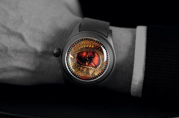 另一款Bubble 47金龙之眼手表顾名思义整枚面盘就是要强调龙的眼睛这个主题,手表的外观设定与Bubble 47金龙伴月手表一样都出自泡泡系列,包括尺寸、材质以及表带类型也都一样,不过昆仑表在面盘上勾勒的画面完全又是另一种意境。品牌采用特殊金属铸造技术,搭配工艺师的巧手细致刻画出拿着放大镜靠近观赏神龙眼睛的拟真感,面盘上可见龙的眼睛周遭的皮肤颗粒分明,而且设色精细,这是因为工艺师细细用手工画上各种色调,形成自然的龙皮纹路,此外龙的眼睛红中带黑色与金色,将瞳孔的气势刻画得十分传神,再加上泡泡表具备圆顶蓝宝石水晶镜面的助威,更加强化了欣赏面盘龙的眼睛图案的乐趣。