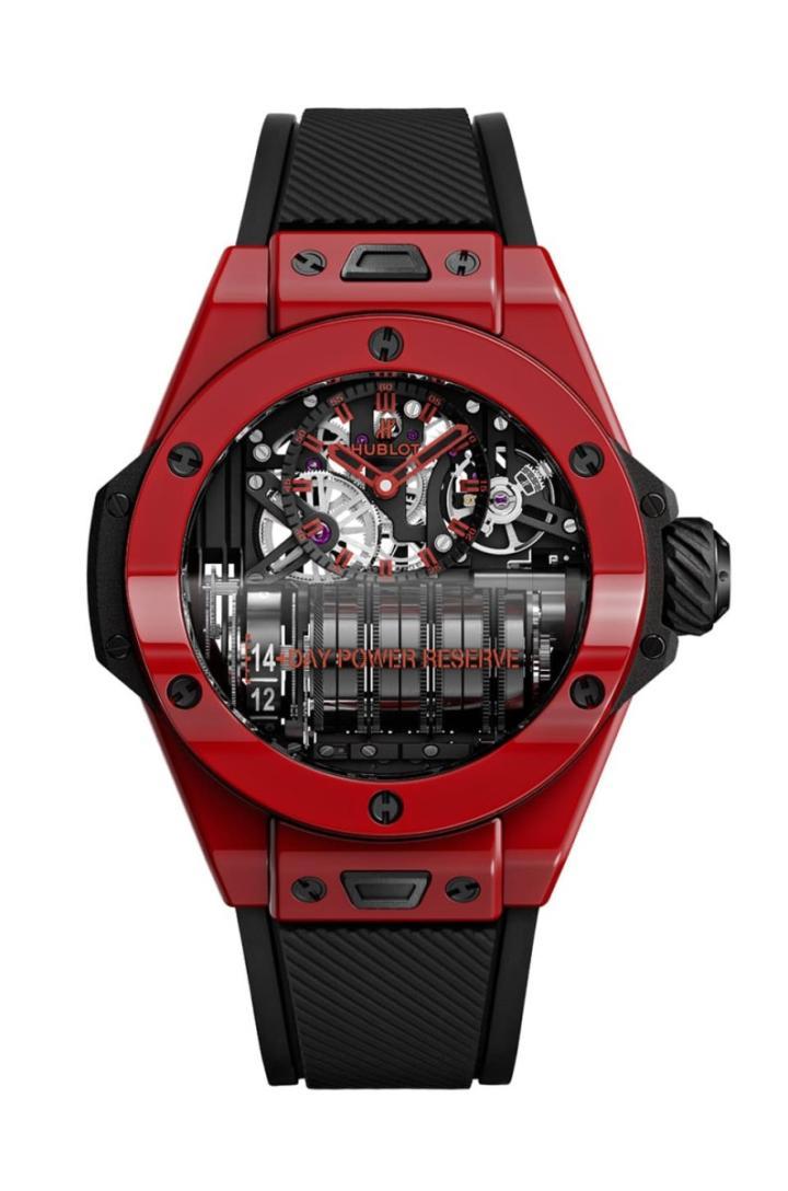 红色陶瓷材质/HUB9011手动上炼机芯/偏心时、偏心分显示/直列式滚筒动力储存显示/蓝宝石水晶镜面、透明底盖/防水300米/表径45mm/限量100只/参考价:¥ 634,120