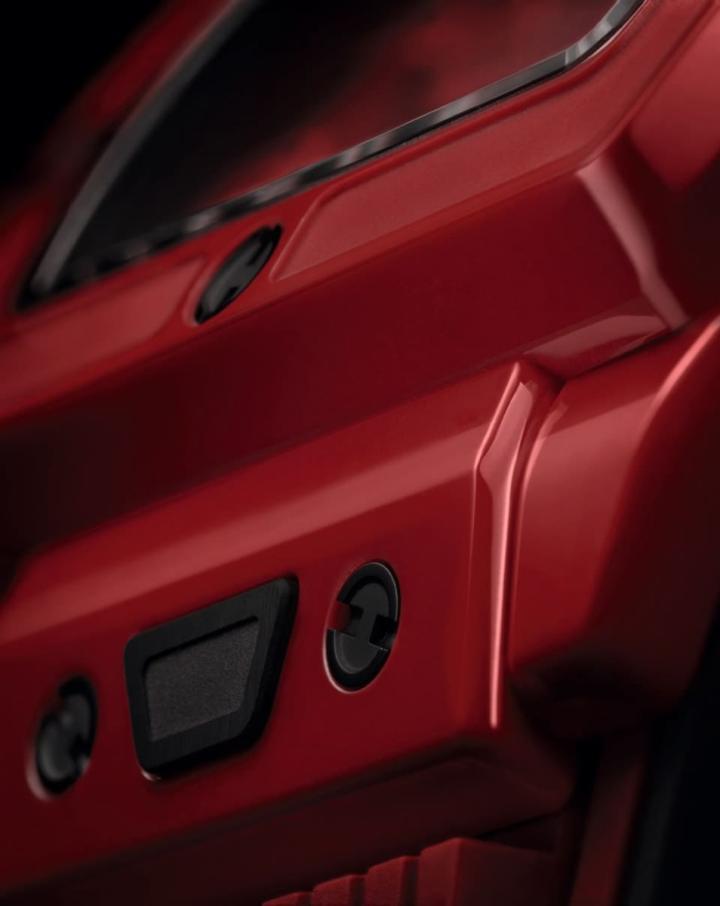 以Big Bang MP11魔力红陶瓷手表为例,它的外观传承大爆炸系列而来,但是由于手表容纳了7枚串联发条盒,加上手表又是采直列式滚筒显示(动力储存显示),使得表壳在中央偏下位置会有一道突起的弧线,对于硬度特别高的陶瓷而言,要做出这种立体的几何形状必须确保制作过程中没有任何闪失,否则很容易就会因为陶瓷碎裂而前功尽弃,不过宇舶显然已找出能够发挥陶瓷特性又能塑造出立体造型的解决办法,令HUB9011这枚手上炼机芯可以容纳近红色陶瓷表壳中,搭配黑色立体刻纹橡胶表带提供轻盈、舒适,又有型的佩戴感受。