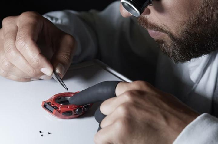 宇舶旗下的冶金材质实验室当初花了四年时间才找到能呈现红色的高科技陶瓷配方,制作过程中先以品牌特定的配方进行融合,并控制温度与湿度成功制作出符合品牌目标的红色陶瓷。经由高温制作出坚硬的陶瓷材质会再经过一连串的机械加工与细致抛光工序,由宇舶调配的红色陶瓷配方标榜可以维持色泽的亮度与持久性,表现出比传统陶瓷更优异的硬度以及抢眼的外观言色。