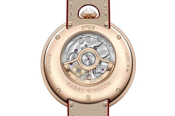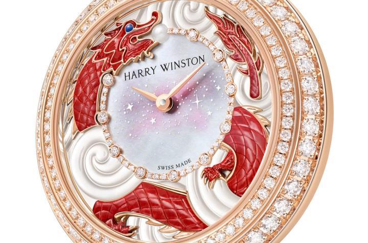 龙嘴所含的珍珠,配上面盘中央内圈的钻石圈还有另一层意思,因为品牌每5分钟会镶上比较大颗的钻石,结合两枚玫瑰金指针遂完成显时的目的,等于既有装饰效果,又具备辅助显时的实际作用。面盘内圈中同为珍珠母贝材质,海瑞温斯顿借助其幻变的光泽质感,并于其上加上白色星形或圆点,造就一幕熠熠生辉的画面,而红色的翔龙充满祥和贵气,其与面盘内圈的珍珠母贝魔幻视觉感受相辅相成,让人感受手表传达的满满喜气与希望朝气。