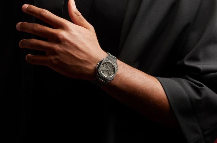 表款的龙形刺青图案最亮眼的部分还是在于面盘,蜷曲缠绕的龙身沿着炼带发展至面盘时露出威严的龙首,画面中的龙张开大口、龙爪也高抬,加上炯炯有神的眼睛不怒而威,BELL & ROSS在此还发挥了一点小巧思,将时、分、秒指针造型修改成波浪状——事实上品牌是将指针化为龙须的概念,这让时标被移至面盘斜面边缘的表面看起来更和谐一致,让人更能融入品牌用心设计的图案情境中。