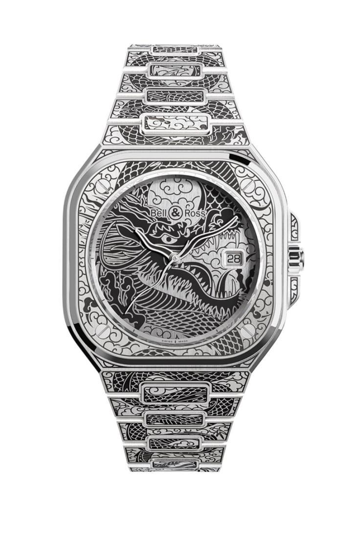 表款的表壳与炼带运用不锈钢材质制成,而之所以会选择BR 05系列作为创作基础的理由也很简单,正是因为表壳(特别是宽大的表圈)有足够宽裕的空间可以让装饰工艺好好发挥。BELL & ROSS用来表现龙图案的形式令人眼睛一亮,品牌参考了刺青艺术的风格,在手表的金属零件外观“刺”上像是全胛式的龙形图案,顿时让BR 05三针手表变得独具艺术感。