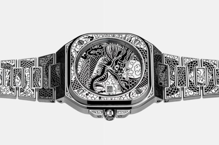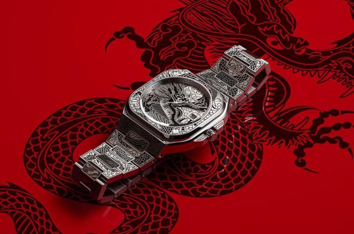 BR 05 Artline Dragon奠基于BELL & ROSS近年新创的BR05系列,其由品牌经典的系列BR 03蜕变而来,针对都会人士的需求,使手表能兼顾运动机能与优雅着装搭配性,包括将表圈扩大、引进金属炼带等,都让品牌主力的方形表壳设计更适于日常任何场合佩戴。BR 05系列前不久延伸出支线作品BR 05 Artline,品牌受到美式Stream-Line摩登流线风格启发,针对手表外观融入近一步的装饰细节;而由BR 05 Artline Dragon的表名可知,BELL & ROSS是将龙年主题图案融入整只表的外型,因此它和BR 05系列的其他作品相较,外观的视觉张力也会更为强烈。
