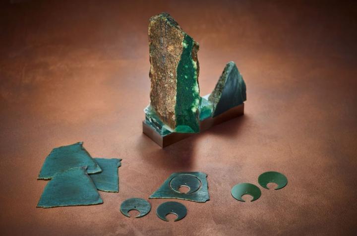 亨利慕时经过精挑细选筛选出制表所需要用到的怀俄明玉石,接着会使用CNC技术在液态环境中对玉石进行精密切割,从而获得厚度仅1~1.2毫米的玉石薄片。这些薄片会用夹具固定并浸泡在水里,然后在灯光下进行检查,从而获得适合制作面盘的部分再加以裁切。选定好的面盘原料会仔细地黏合在金属板上,后续还是要用CNC技术铣削成适合与表壳搭配的面盘零件,包括厚度也要经过切密计算,等到收尾阶段,亨利慕时还会把玉石交予玉石工匠手工抛光,让玉石表面可以光滑无瑕。