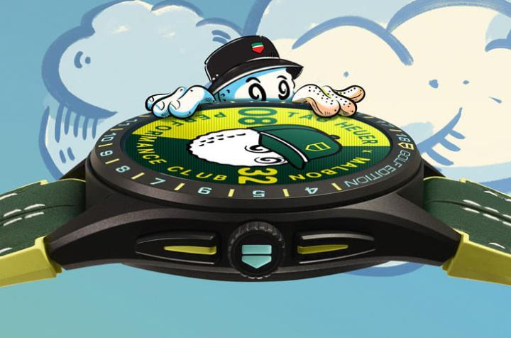 泰格豪雅为手表配置点缀黄色调的深绿色橡胶与小牛皮复合材质表带,呼应表壳细节的颜色;不只表带,品牌也特地结合MALBON GOLF的元素创作出两款独特表面,画面中可见MALBON GOLF的动画式代表人物,它戴着印有泰格豪雅盾牌标志的球帽,而且这个人物还会随着分秒变化而有不同动作,仿佛住在手表里面一样洋溢趣味,此一表面适用于所有Connected智能表,因此如果只是单纯喜欢这个表面造型的Connected智能表表主,也可以迳行下载来使用。另一种表面则和泰格豪雅自身比较有关,其能呈现出与Heuer 02机芯连结的造型。