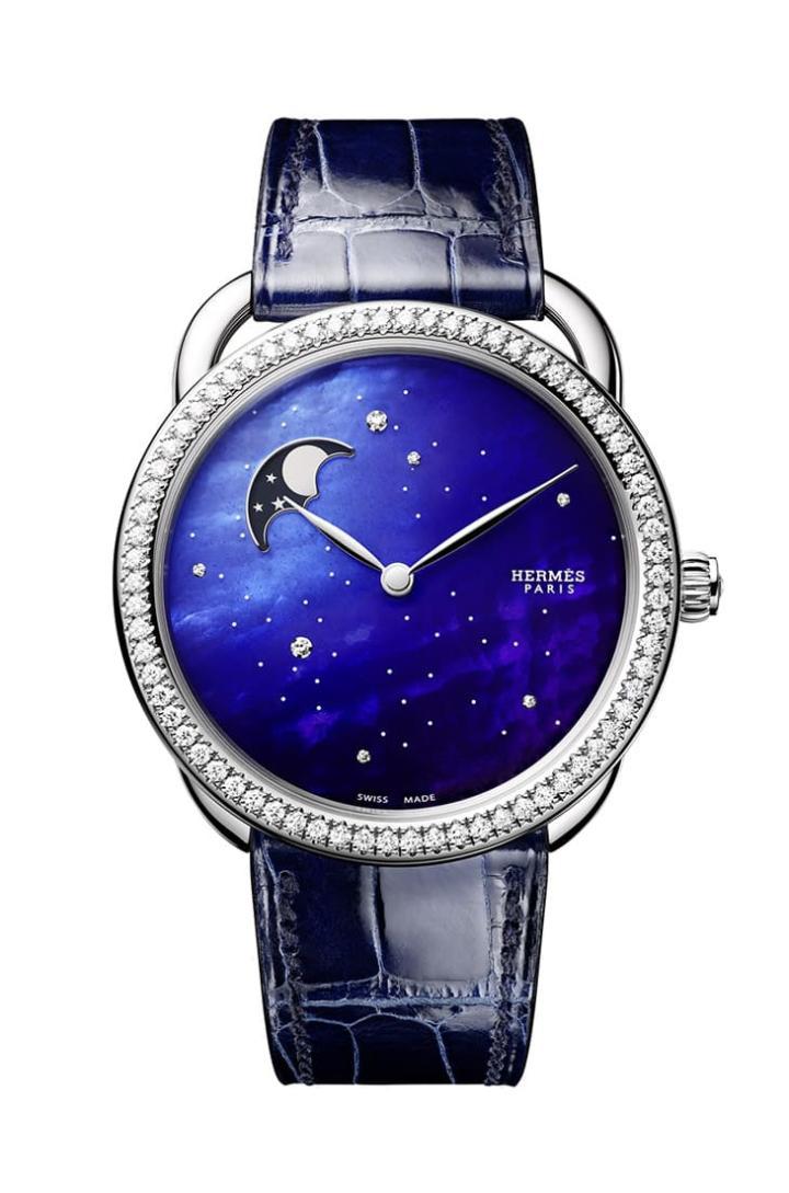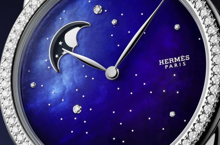 HERMÈS爱马仕在2024年的日内瓦钟表与奇迹表展之前先小试身手发表今年其中一款新作Arceau Petite Lune ciel étoilé小月相表,手表的整体意境让人联想起晴朗夜空中,高挂在天上的明月与繁星,品牌透过配色以及钻石装饰的点缀,替手表勾勒出一股浪漫醉人的印象。