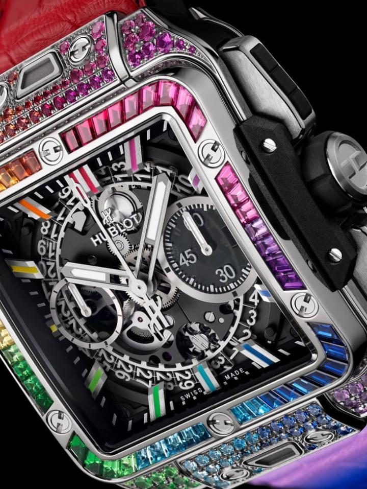 Square Bang Unico彩虹宝石计时码表奠基于系列的方形基础,然而手表外观蜕变得更为大胆抢眼,关键不仅是宇舶采用钛金属或皇金制作表壳,还包括表壳与表圈上镶嵌了多达50颗的梯形切割彩色宝石,而在表壳部分更是镶上94颗明亮式切割彩色宝石,总计手表外观共镶嵌8种颜色的宝石,包括红宝石、粉色蓝宝石、紫水晶、蓝色蓝宝石、蓝色托帕石、沙弗莱石、黄色蓝宝石以及橙色蓝宝石,塑造出犹如腕上彩虹般的“睛”艳视觉效果。
