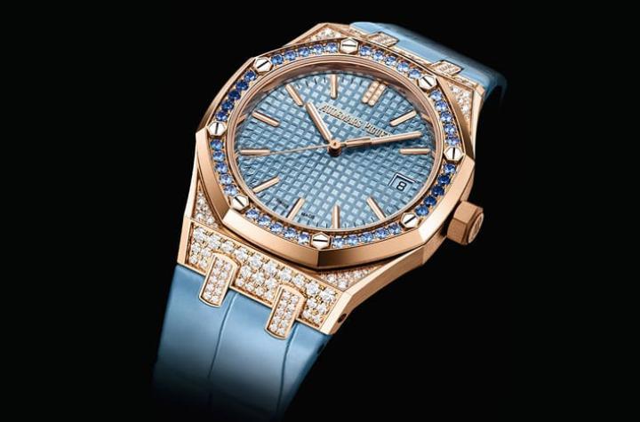 皇家橡树系列今年新作还有个亮点在于品牌增加了偏向珠宝表风格的小尺寸基本款。原本37mm的皇家橡树自动大三针已于2022年系列50周年时改换爱彼AP新研发的5900机芯,由于这种尺寸女性佩戴也很合适,前两年品牌也曾推出不同材质表圈镶钻的版本吸引市场目光。2024年37mm的皇家橡树自动表进一步升华镶钻设计,爱彼AP分别发表玫瑰金与白金款各一,两款都将镶钻范围由表圈延伸至表壳与表耳,以玫瑰金款为例,它光是在表壳、表扣与AP字样折叠扣等零件上便镶有164颗美钻,而表圈部分则是改镶共40颗渐层蓝色蓝宝石,搭配浅蓝色珠光鳄鱼皮表带以及浅蓝色Grande Tapisserie大型格纹面盘(连日期转盘也是相同颜色),呈现出优雅雍容的粉色系视觉震撼力,而品牌也还特别在12点方向的双重玫瑰金立体时标镶上左右各4颗钻石成为点睛之笔。