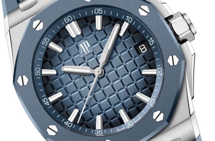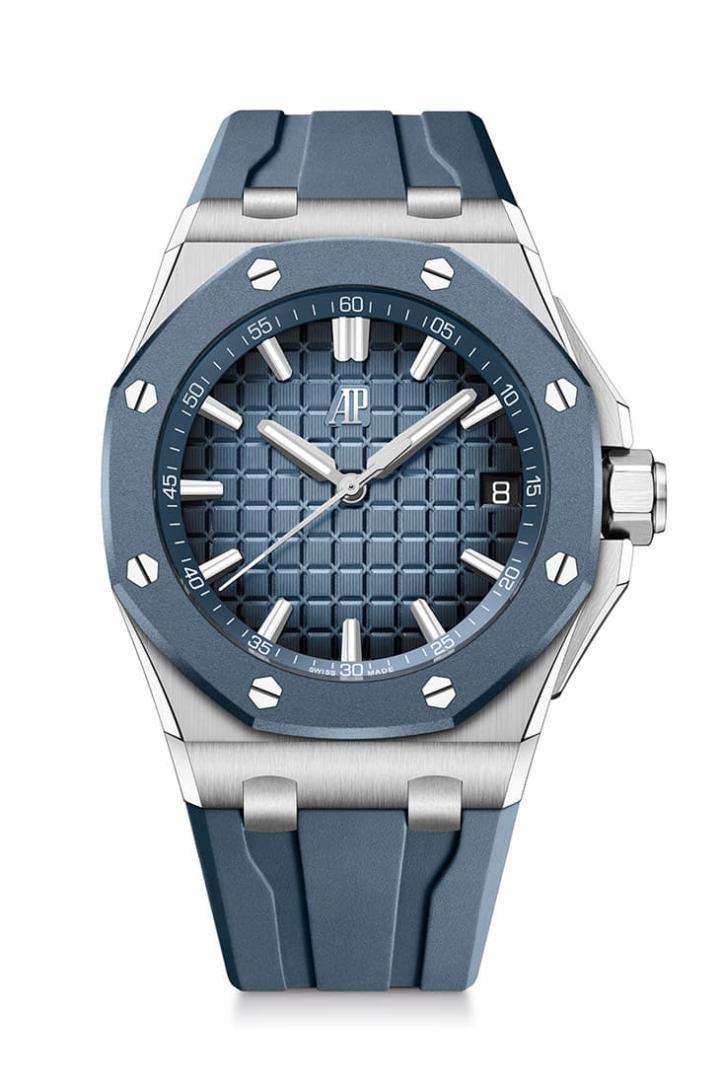 皇家橡树离岸型自动表以不锈钢材质制作,其43mm表径为系列主流规格,手表的蓝灰色表圈第一眼以为是陶瓷材质,但其实品牌在此用上的是橡胶覆层,反而表冠侧面没有再另外用橡胶包覆,至于手表的表带也是与表圈同色的橡胶材质,从不锈钢加上橡胶这样的组合可见爱彼AP还是遵循着系列加强版运动表的定位,致力于让手表可以耐操、实用,而且读时效果一清二楚。附带一提,品牌有略微调整过表冠护肩装置,大致上是把护肩高度降低、左右两侧线条拉长,让手表的线条更流畅简练。