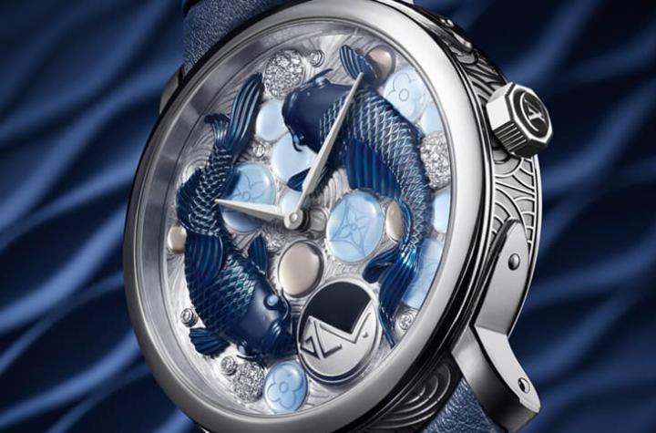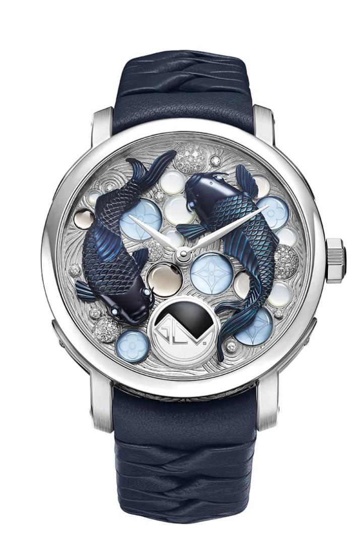 首先看到“奇幻宝箱”系列的花园锦鲤,表款以白金制作表壳,面盘呈现一幕两条锦鲤在清澈溪流小漩涡中悠游的景象。为了呈现出这幅画面,路易威登先用手工雕刻出白金面盘的波浪花纹,其中6点钟方向镶有一枚刻有加士顿.威登首字母(GLV)、镶嵌缟玛瑙的铭牌,因为品牌当初在创作这系列时是受到品牌第三代传人加士顿.威登所收藏的古董“刀镡”所启发,因此在面盘上强调了此一设计渊源,这也成了这系列手表的一大共同特征。