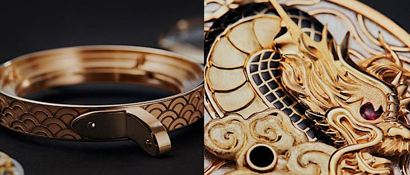 云中之龙这款作品的面盘经过锤打处理后,再切割出槽纹并且镶嵌长度不一的黄金或玫瑰金金属丝,镶嵌过程是用冷加工处理,工艺师之后还要用手工细部雕刻和修饰,这种工艺也就是表坛罕见的大马士革镶嵌,透过这种技法可以让不同色泽的金属呈现彷似层叠的有机纹理,最终形成云中之龙面盘背景的空中云彩景观。