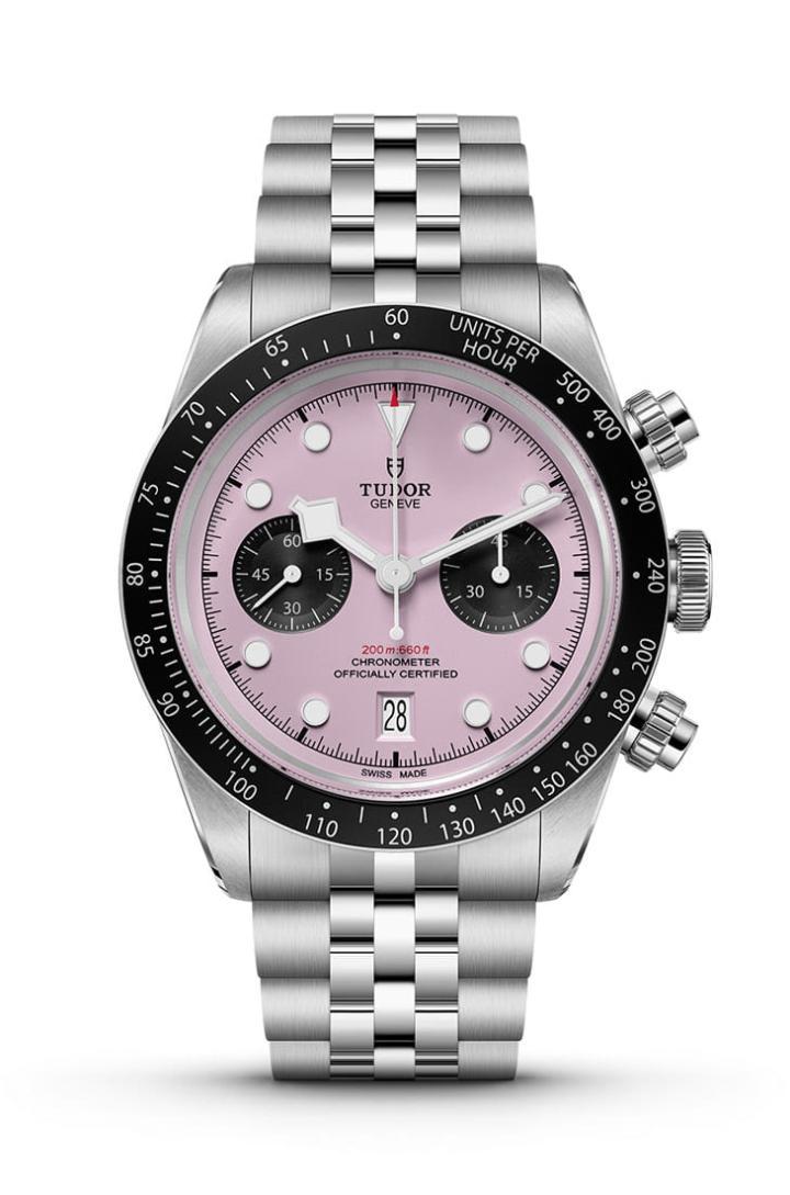 虽然Black Bay Chrono粉红款强调面盘颜色换然一新,不过手表的阳极氧化铝圈还是和其他Black Bay计时码表一样是黑色,表圈侧测速计刻度颜色则是银白色,另外计时按把与表冠也都采旋入式设计以巩固手表标榜的200米防水性能。至于这款表与过往Black Bay计时码表最大的不同便在于继黑色、蛋白石色与金色后,崭新采用粉红色面盘诠释音乐天王周杰伦的个人特色,手表的双眼小表盘与表圈同样是黑色,形成粉嫩色调的另类熊猫面组合。