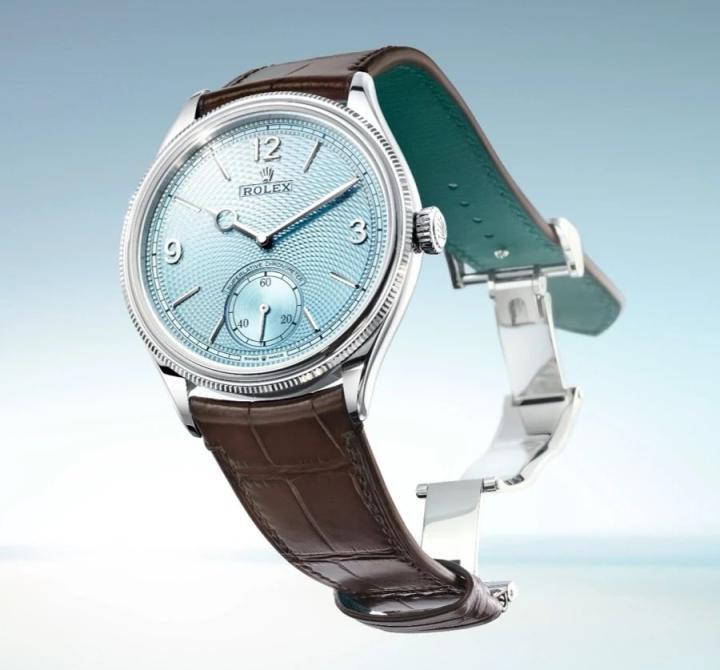 恒动1908型推出950铂金款,配备冰蓝色谷粒纹表盘。表盘图案由机刻雕花工艺打造,即利用车刀,在物体表面雕刻几何图案。