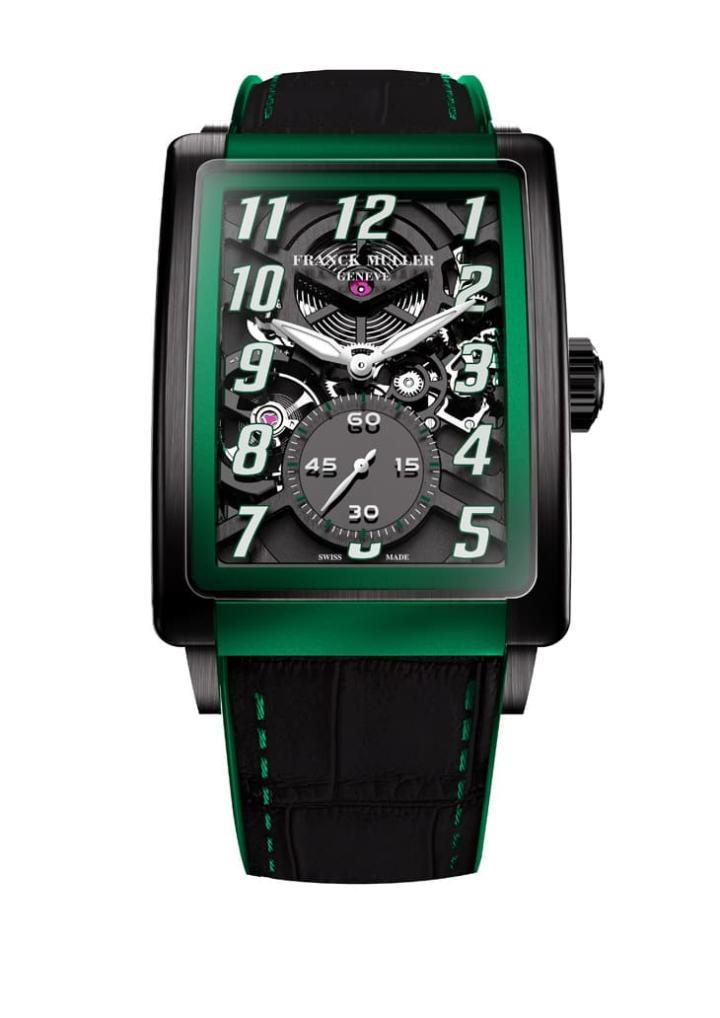 Long Island Evolution Giga Tourbillon带有FRANCK MULLER擅长研发的陀飞轮复杂功能,这款表的陀飞轮在于它的框架直径达到20mm,几乎占据了面盘的下半部,超大体积在手表面盘上运作时存在感强烈。为了让陀飞轮可以稳定的运作,品牌于框架外围设置了三个支撑桥板,细看陀飞轮固定桥板的造型,刚好和面盘上半部发条盒的桥板如出一辙,发条盒呈现两两排列,在两者之中设有一枚扇形的动力储存显示,其将发条盒的四天动能转化成白、绿双色刻度,每到发条动能将耗尽时,指针就会往绿色刻度方向移动,整体设计既有高工艺质感,配上黑绿色系又带着一丝科幻前卫氛围。表款的面盘零件大部分都镀成黑色,包括显时指针与动力储存指针也都是黑色,和机芯零件的桥板、陀飞轮框架等呼应,而且指针上都有夜光涂层,在暗处的读时效果不需过于担心。