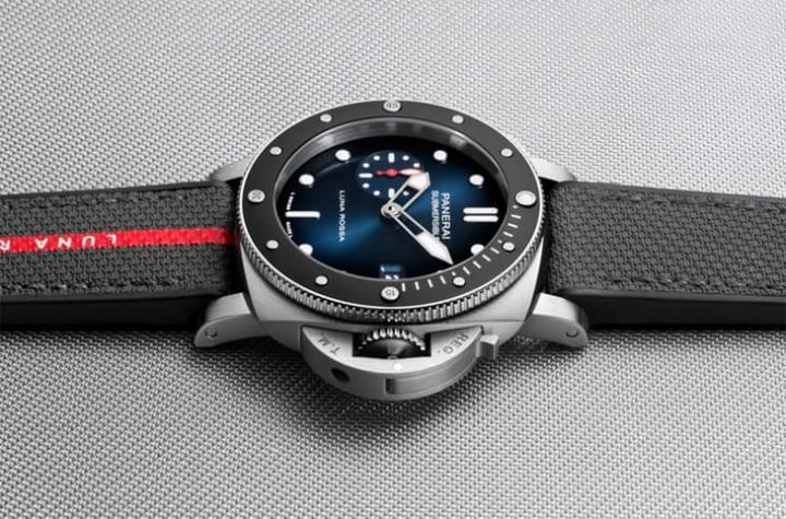 PAM01565的小三针面盘格局搭配渐层蓝色太阳放射纹装饰,也就是面盘从边缘到中心呈现黑色过渡到蓝色的效果,这种配色是在呼应Luna Rossa船队总是在海洋上奋勇前进的精神。手表面盘与沛纳海2024年其他船队联名表同样在面盘6点方向印有“LUNA ROSSA”字样,注意到9点方向的小秒针为红色,这和手表的灰色双材质表带饰有红色条纹有相同目的,都是品牌为了向Luna Rossa船队致敬而设置的桥段。当然面盘上的指针、时标、表圈12点方向的圆点标记全部都有Super-LumiNova®夜光涂层,在暗处或水下,手表都能持续显示当前正确时刻,提供佩戴者可靠的实用性。