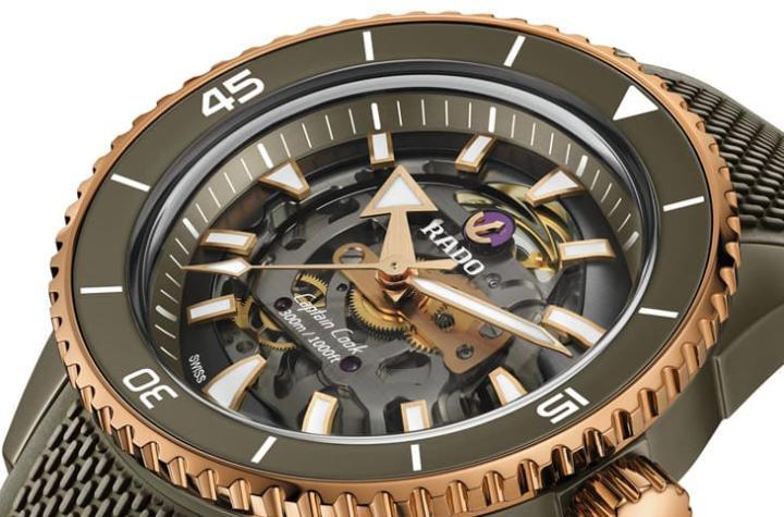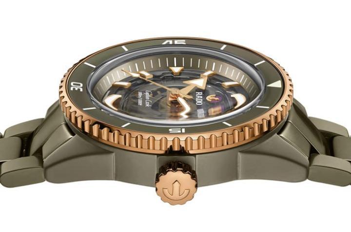 全新库克船长高科技陶瓷镂空表以高硬度、保护性佳的陶瓷制作表壳,而且它的陶瓷款还是黑、白等主流色以外的“特殊色”,光是表壳的陶瓷颜色就已经建立起手表的鲜明印象,同时雷达表也替其配置了绿色橡胶表带或橄榄绿色高科技陶瓷三排炼节练带等两种款式供表迷择其所爱。手表的旋入式表冠以及表圈组件都镀上了玫瑰金色,使得手表不只有休闲运动感,还伴随一股低调的高雅个性,同时其防水性能达到300米,在日常生活佩戴无往不利。